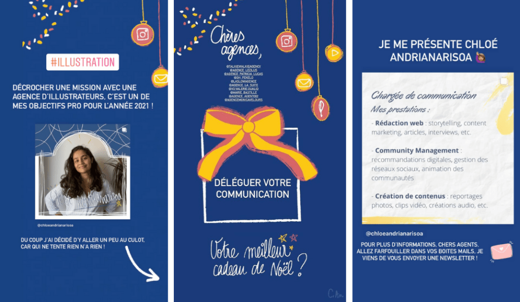 | Laissez-moi vous raconter un tout petit conte de Noël… 🎄🎄🎄 D’un côté il y a vous, agent d’illustrateurs et d’illustratrices. Entre prospection de clients, review de portfolios, recherche de nouveaux talents, points comptabilité, rendez-vous téléphoniques et conférences zoom, vous n’avez peut-être pas la tête à vos réseaux sociaux ou à l’actualisation de votre site internet ! Le métier d’agent est déjà bien assez fourni et complexe comme ça ! Vous vous dites que pour 2021, vous aimeriez bien vous décharger de votre communication. De l’autre, il y a moi, chargée de communication en Freelance, qui a fait ses armes dans une agence de communication spécialisée dans la culture, et qui rêve de travailler pour le monde de l’illustration. Et PAF ! Une newsletter arrive dans votre boîte mail, juste avant les fêtes ! Bien à propos, elle vous présente mes compétences et ma motivation pour vous accompagner et vous épauler dans votre stratégie digitale. Et là, c’est la ✨ magie de Noël ✨, mon profil vous parle, vous souhaitez qu’on s’appelle à la rentrée pour en discuter ! |