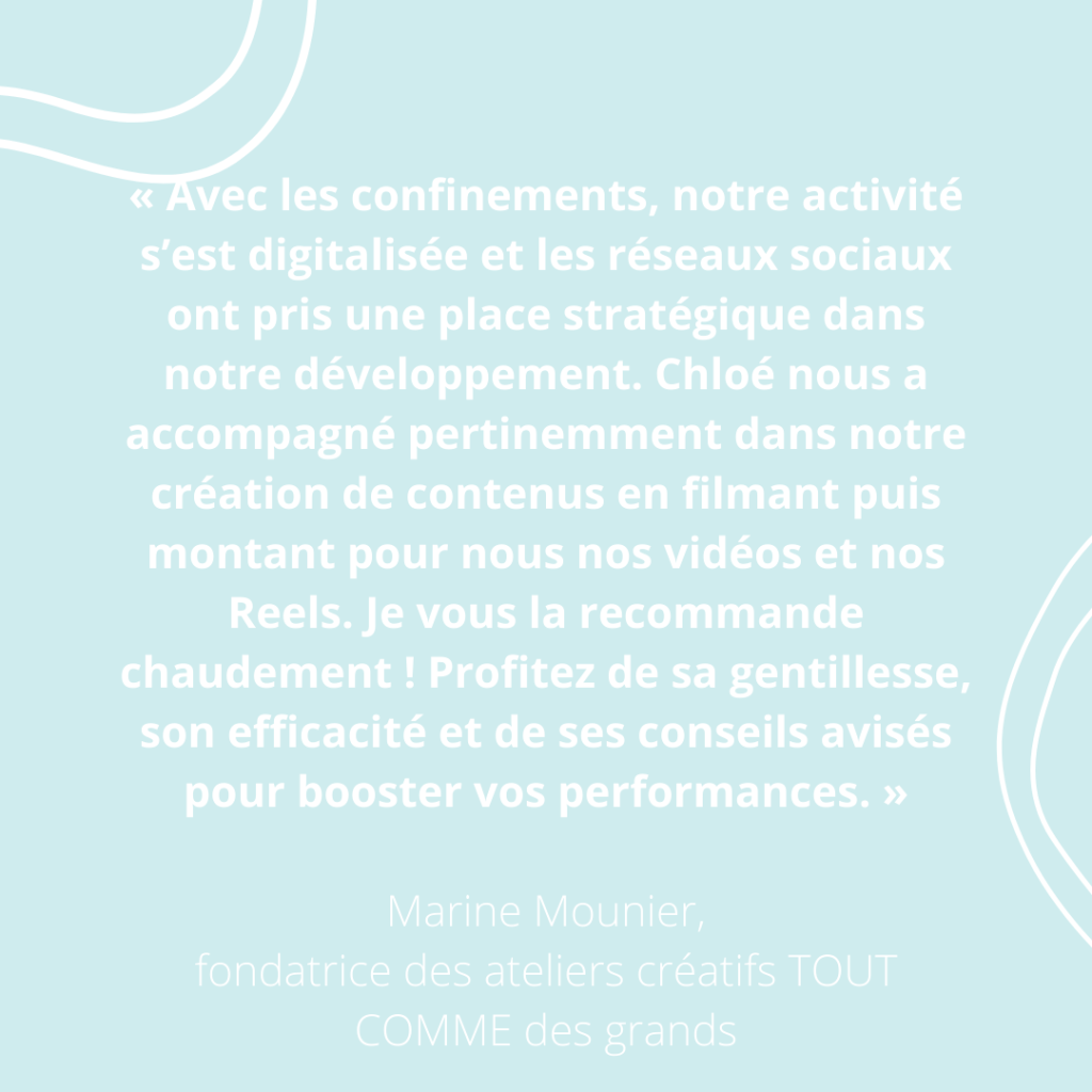 J’ai réalisé pour cette entreprise un audit de son usage des réseaux sociaux et une liste de recommandations stratégiques et techniques pour améliorer son e-réputation sur Instagram, Facebook, LinkedIn et Pinterest. Mon accompagnement se poursuit régulièrement pour mettre en place toutes ces recommandations. J’ai également réalisé des plannings de publications spécifiques pour les réseaux sociaux des ateliers, et je m’occupe du tournage et du montage de Reels, format central pour le développement de la communauté de TOUT COMME des grands sur Instagram.